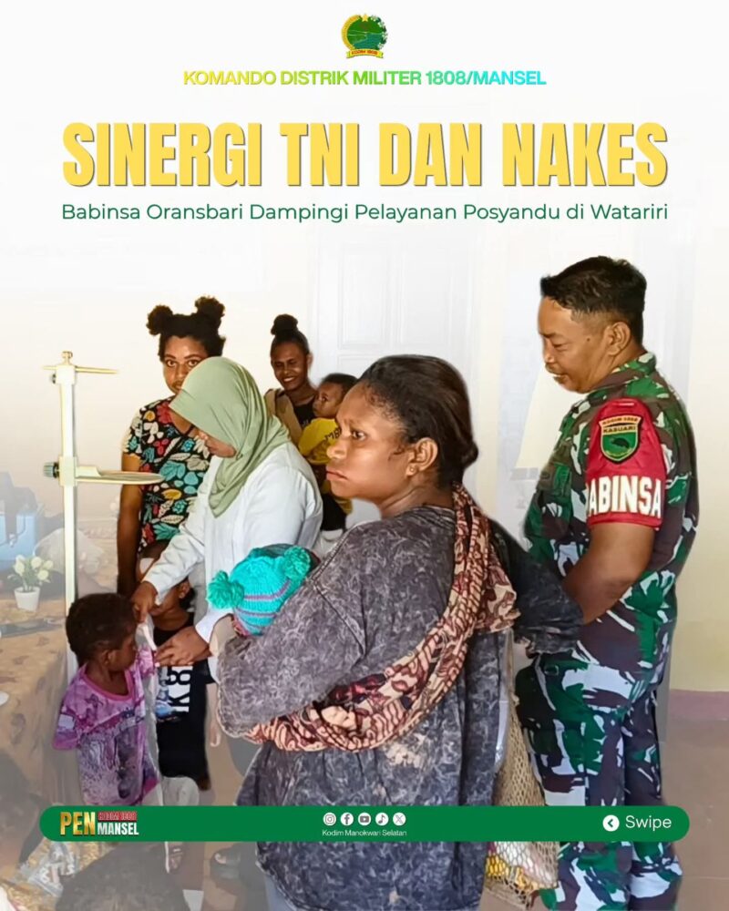 ORANSBARI || viralindonesianews.com — Sebagai wujud kepedulian terhadap kesehatan masyarakat binaan, Babinsa Koramil 1808-02/Oransbari, Sertu Nursamsi, melaksanakan pendampingan pelayanan Posyandu di Kampung Watariri, Distrik Oransbari, Kabupaten Manokwari Selatan, Rabu (15/4/2026).