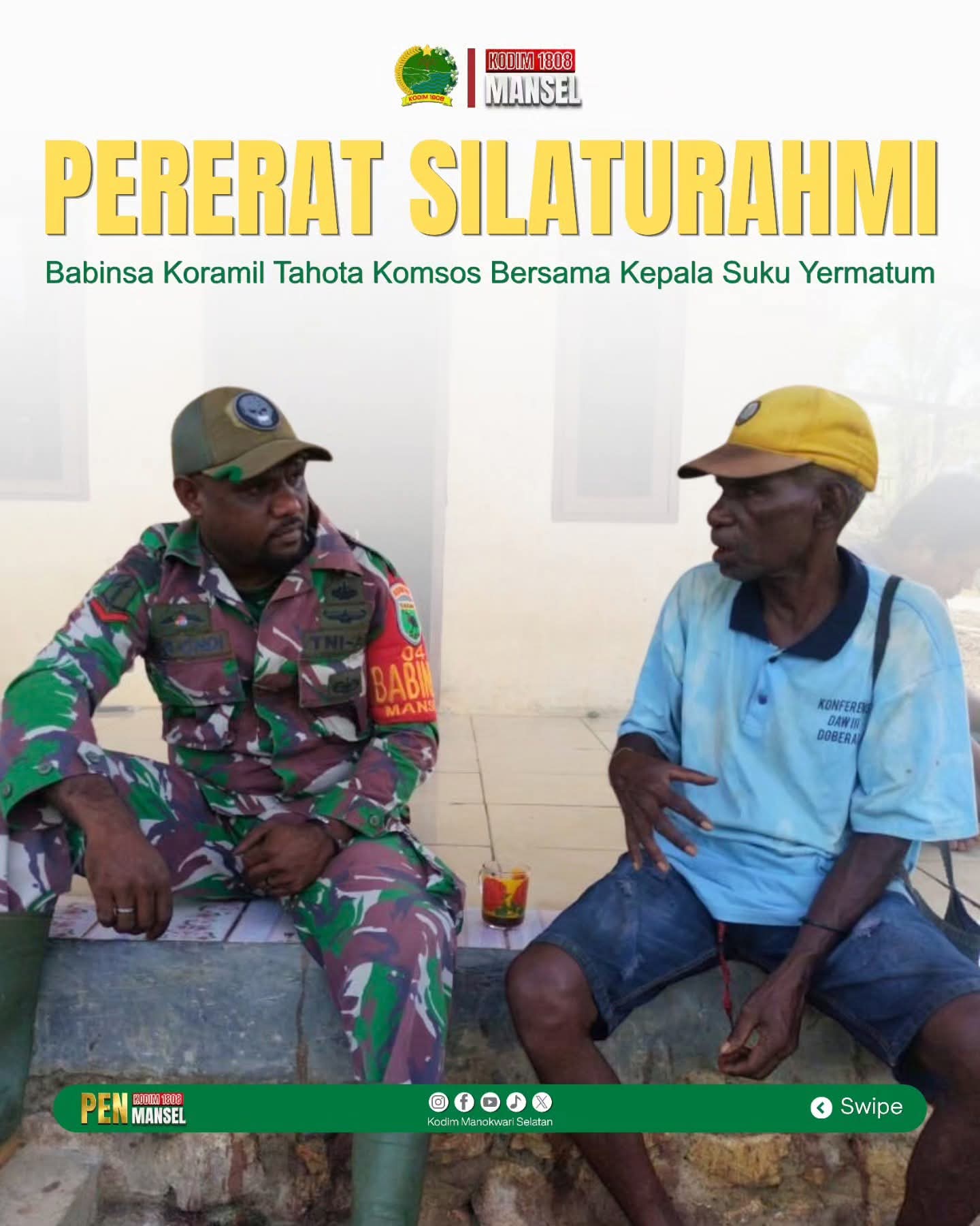 Pada Rabu (22/4/2026), Babinsa Kopda Mario Ondi melaksanakan kegiatan Komunikasi Sosial (Komsos) bersama tokoh masyarakat di Kampung Yermatum. Kegiatan ini menjadi bagian dari tugas rutin Babinsa dalam menjaga kedekatan dengan warga sekaligus membangun komunikasi yang efektif di tingkat kampung.