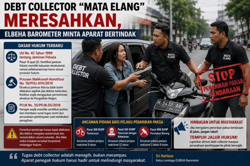 SALATIGA |viralindonesianews.com| – Lembaga ELBEHA Barometer mendesak aparat penegak hukum menindak tegas praktik debt collector atau “mata elang” yang masih berkeliaran di Kota Salatiga dan Kabupaten Semarang. Keberadaan mereka dinilai meresahkan masyarakat karena masih ditemukan penarikan paksa kendaraan di jalan terhadap konsumen yang menunggak cicilan.
