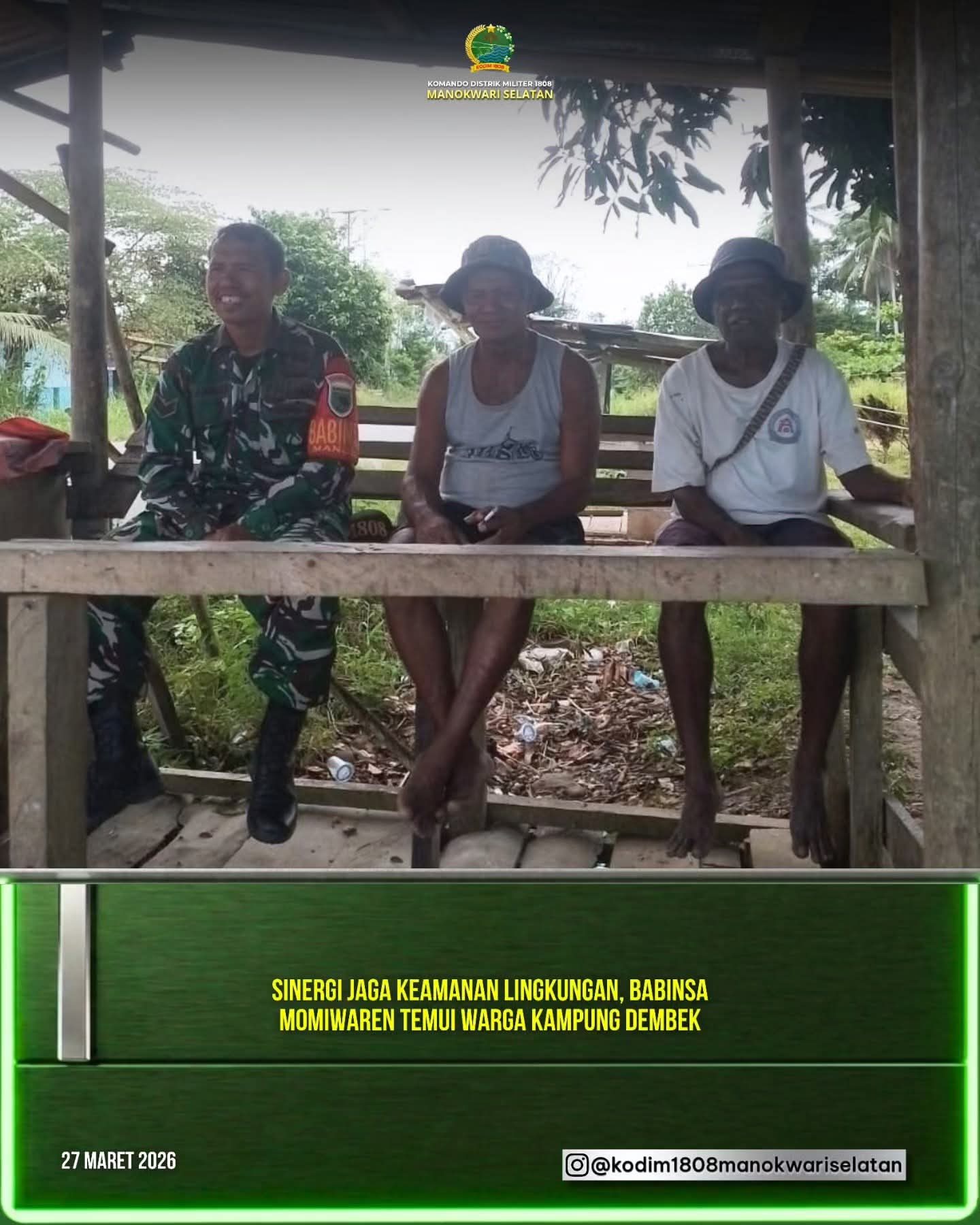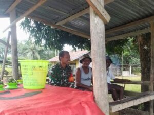 Kegiatan pembinaan teritorial tersebut dilaksanakan di Kampung Dembek, Distrik Momiwaren, Kabupaten Manokwari Selatan. Dalam kesempatan itu, Sertu La Ode Anwar menyambangi salah satu warga, Marten Aiba (56), yang berprofesi sebagai petani.