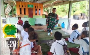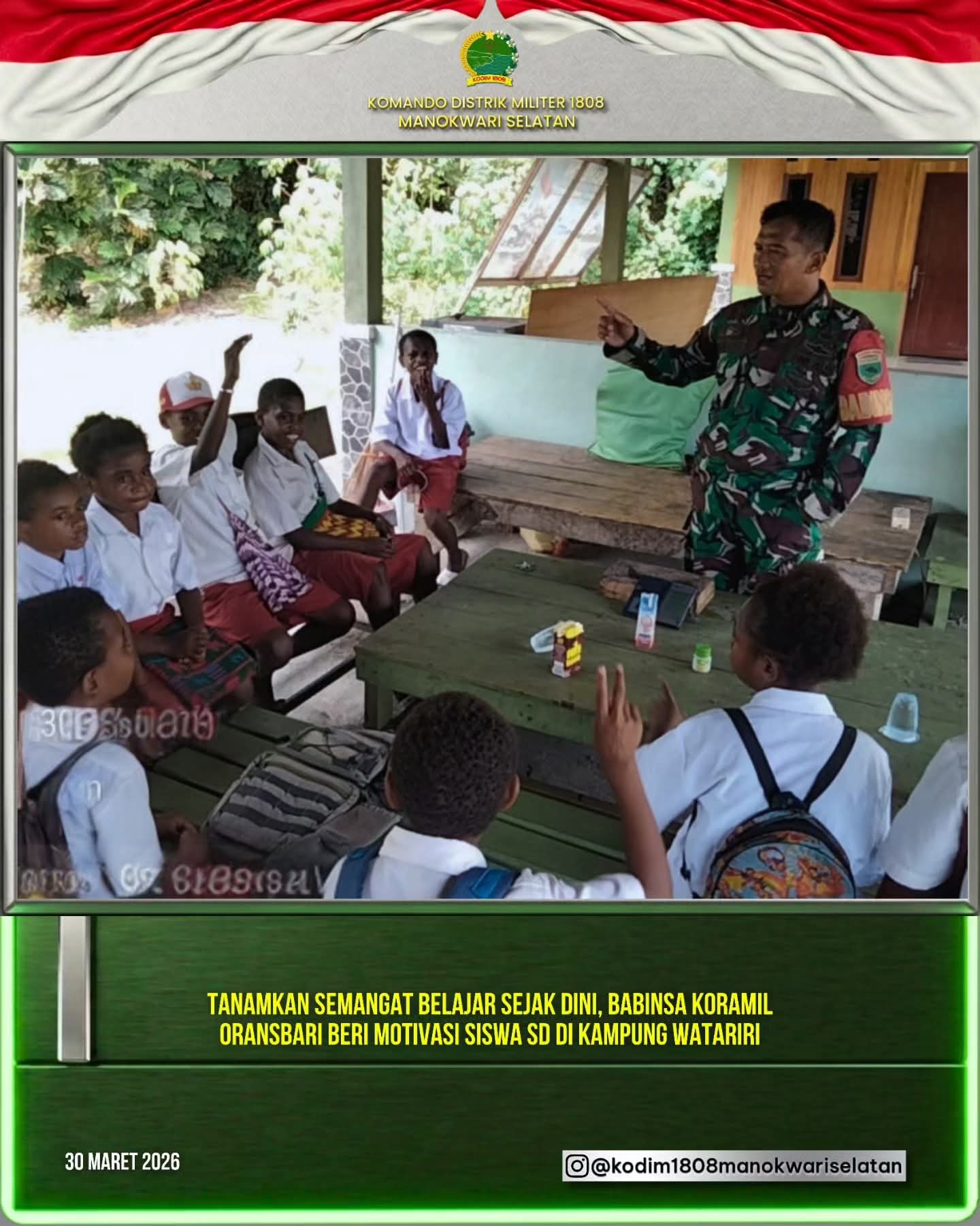 ORANSBARI || viralindonesianews.com– Dalam rangka melaksanakan pembinaan teritorial sekaligus mempererat hubungan dengan masyarakat, Babinsa Koramil 1808-02/Oransbari turun langsung menyapa anak-anak di Kampung Watariri, Distrik Oransbari, Senin (30/3/2026).