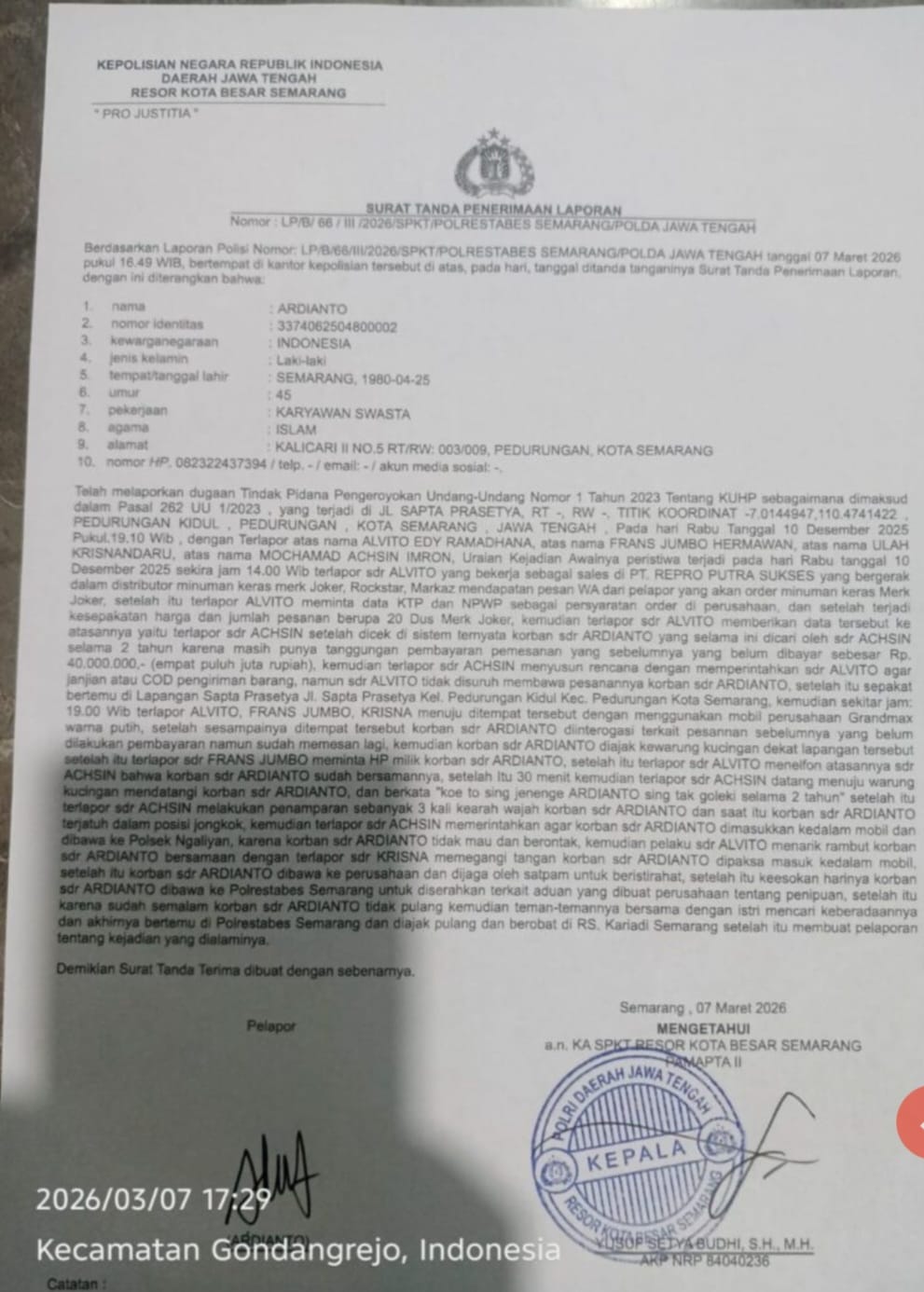 Pada Sabtu (7/3/2026), korban yang juga pimpinan media M. Supadi atau akrab disapa Kang Adi kembali mendatangi Polrestabes Semarang untuk menjalani pemeriksaan lanjutan sekaligus memberikan keterangan tambahan kepada penyidik.