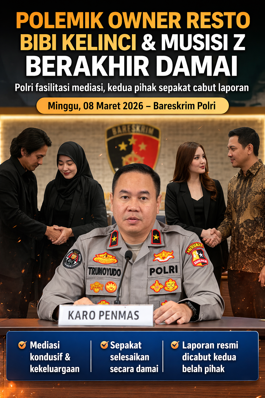 Jakarta | viralindonesianews.com | 09- maret- 2026, – Polemik yang melibatkan owner restoran Bibi Kelinci berinisial NO dengan seorang musisi berinisial Z bersama istrinya E akhirnya berakhir damai. Perdamaian tersebut tercapai setelah Polri memfasilitasi proses mediasi antara kedua belah pihak melalui Biro Pengawasan Penyidikan (Wassidik) Bareskrim Polri.