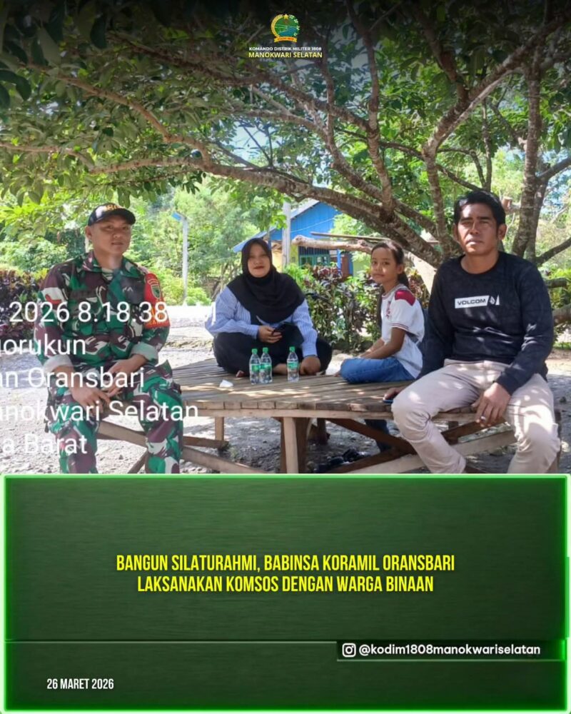 ORANSBARI || viralindonesianews.com – Dalam rangka menjalankan pembinaan teritorial di wilayah binaannya, Babinsa Koramil 1808-02/Oransbari, Kopda Lutfhi, turun langsung menyambangi warga untuk melaksanakan kegiatan komunikasi sosial (komsos), Kamis (26/3/2026).
